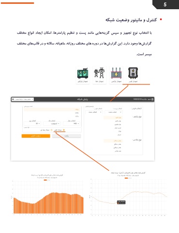 5 ▪ کنترل و مانیتور وضعیت شبکه با انتخاب نوع تجهیز و سپس گزینههایی مانند پست و تنظیم پارامترها ،امکان ایجاد انواع مختلف گزارشها وجود دارد .این گزارشها در دوره های مختلف روزانه ،ماهیانه ،سالانه و در قالبهای مختلف میسر است.